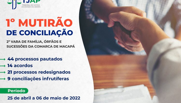 Sob a titularidade da juíza Elayne Cantuária, a 2ª Vara de Família, Órfãos e Sucessões da Comarca de Macapá realizou, no período de 25 de abril a 06 de maio de 2022, o 1º Mutirão de Audiências Conciliação em sistema híbrido, com acolhimento tanto remoto quanto presencial das partes dos processos. Foram pautados 44 processos com temas diversos na área de família, 14 acordos realizados, 21 processos redesignados (por ausência de uma ou mais partes) e nove conciliações infrutíferas.