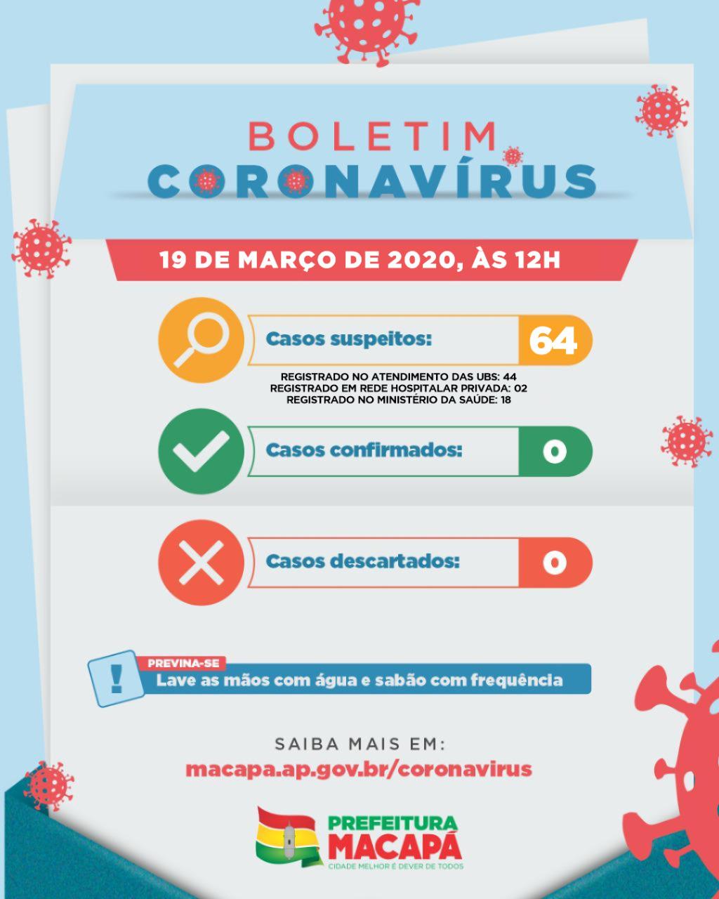 O Município de Macapá passa a monitorar 64 casos suspeitos de Coronavírus, dos novos 14 registrados na madrugada do dia 19 de março. Doze foram atendidos em Unidades Básicas de Saúde e dois em hospital particular, mas que realizaram coleta de exame e são acompanhados também pela vigilância municipal. Após coleta de exame, eles foram liberados para isolamento domiciliar por apresentar sintomas leves da doença, recebendo kits de máscaras e recomendações sobre cuidados básicos.