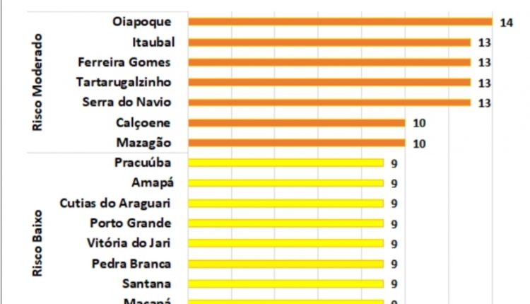 Segundo dados do último levantamento do Governo do estado do Amapá (GEA), a maioria dos municípios do estado se encontram na faixa de risco baixo à moderado. A tabela que vai de 0 à 40, é dívida pelas cores: verde para risco muito baixo (0-1), amarelo para risco baixo (1-9), laranja para risco moderado (10-18), vermelho para risco alto (19-30), e roxo para risco muito alto (31-40). 9 dos 16 municípios do estado encontram-se na faixa amarela, e 7 na faixa laranja. A cidade com menor risco de contágio é Laranjal do Jari com nível 4 na tabela, e a com maior é Oiapoque com nível 14.