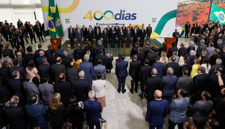 O presidente Jair Bolsonaro e ministros de Estado apresentaram, no Palácio do Planalto, o balanço de 400 dias de governo. Em seu discurso, o presidente agradeceu o empenho dos ministros e ressaltou entregas importantes de seu governo. “O nosso entendimento, a nossa união, a nossa vontade de acertar, a nossa percepção das necessidades do povo, juntando isso, nós temos como realmente mudar o destino do Brasil. Se mudamos um pouco agora, reconheço, teve alguma mudança, podemos mudar muito mais”, disse Bolsonaro.