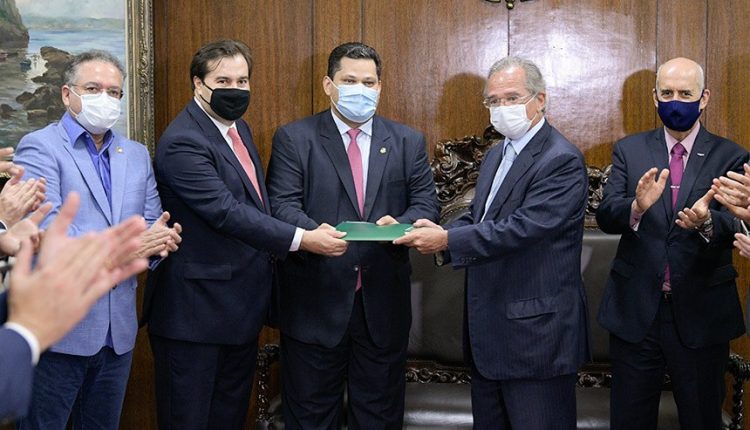 Guedes entregou o projeto em mãos aos presidentes do Senado, Davi Alcolumbre, e da Câmara dos Deputados, Rodrigo Maia. Ele será incorporado à tramitação das duas iniciativas que já estão em andamento (PEC 45/2019, da Câmara, e PEC 110/2019, do Senado).