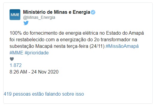 O anúncio do término do rodízio foi feito pela Companhia de Eletricidade do Amapá (CEA) às 8h12 desta terça. O Ministério de Minas e Energia também se pronunciou através das redes sociais.