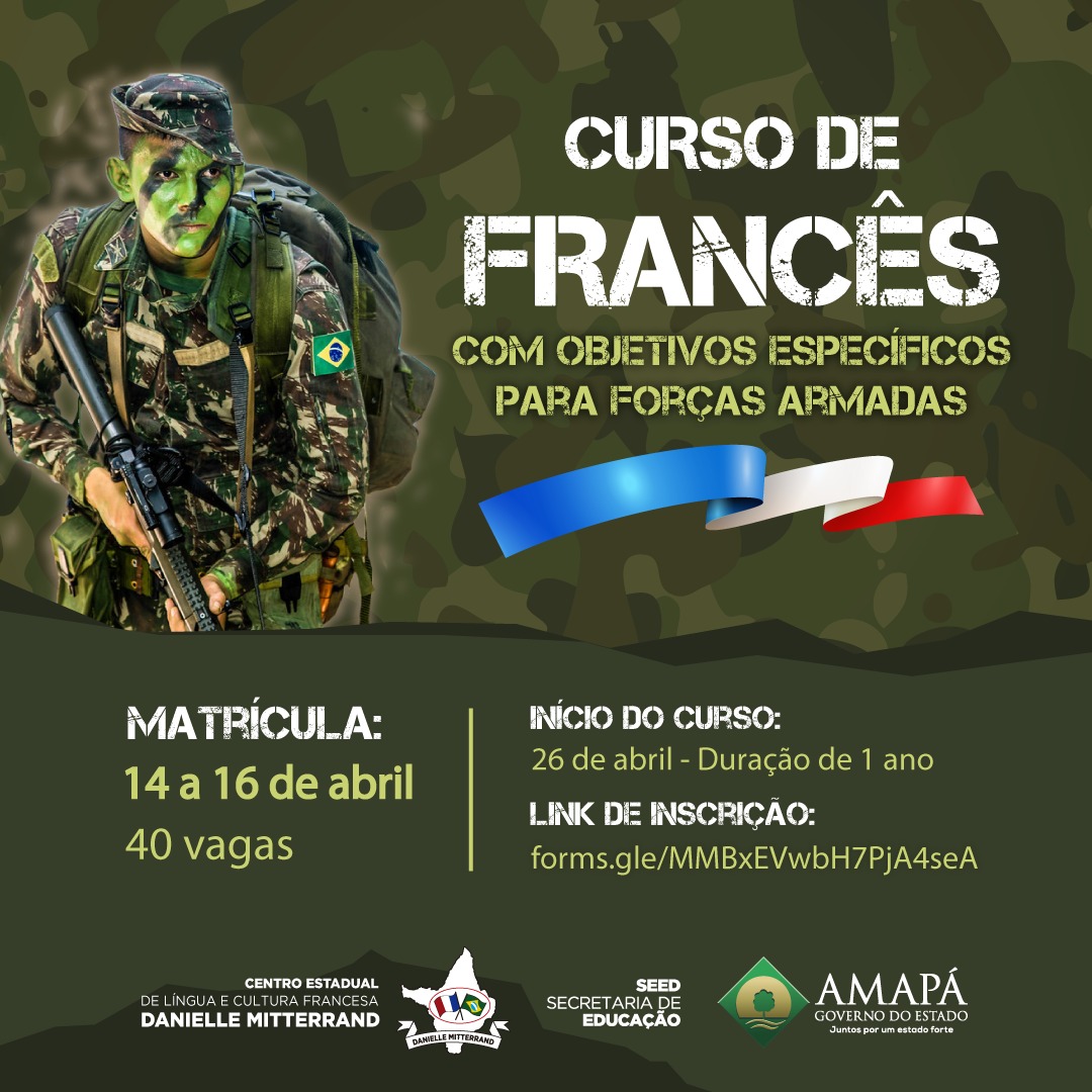 A Secretaria de Educação (Seed), através do Centro Estadual de Língua e Cultura Francesa Danielle Miterrand, firmou parceria com o Exercito Brasileiro e o Exercito Francês para promover o curso de francês com objetivos específicos para as Forças Armadas do Amapá.