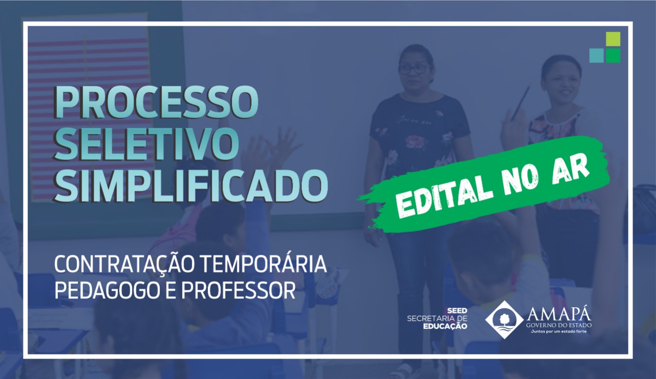 O Governo do Amapá lançou o edital para contratação temporária de professores e pedagogos. Os profissionais irão atuar na educação básica e profissional nas escolas da rede estadual de ensino localizadas na capital, municípios e distritos, e nos centros especializados, durante o ano letivo de 2020. O processo é conduzido pela Secretaria de Estado da Educação (Seed). São 1.117 vagas ofertadas. A inscrição é online no site www.processoseletivo.ap.gov.br e inicia dia 03 de fevereiro e segue até o dia 06 do mesmo mês. Clique aqui e baixe o edital