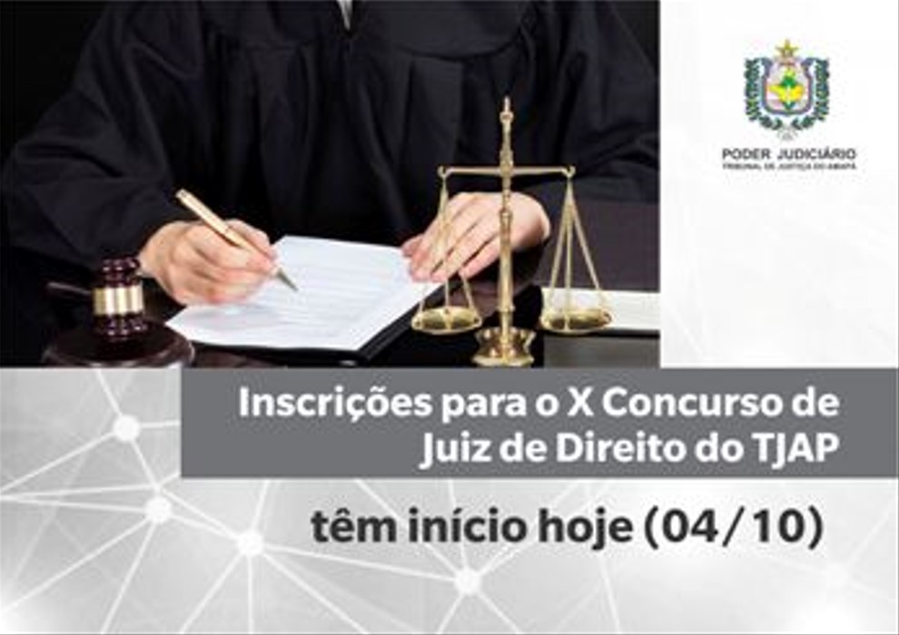 Candidatos que atenderem aos requisitos podem se inscrever, a partir das 16 horas de hoje, segunda-feira (04/10), para o X Concurso para Provimento de Vaga de Juiz de Direito Substituto do Tribunal de Justiça do Amapá (TJAP). As inscrições seguem até as 16 horas do dia 04 de novembro de 2021. O concurso pretende preencher 11 vagas já existentes na magistratura estadual, mas outras podem surgir no período de sua validade de dois anos – prorrogável por igual período. (ACESSE AQUI O EDITAL)