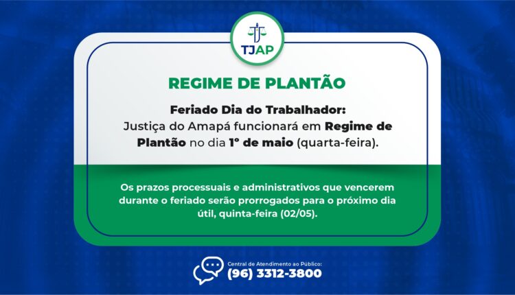O Tribunal de Justiça do Amapá (TJAP) funcionará, nesta quarta-feira (1º de maio), em regime de plantão, devido ao Feriado do Dia do Trabalhador/Dia do Trabalho. O plantão se aplica a todas as unidades judiciais e administrativas, em de 1º e 2º Graus, de acordo com o que dispõe o art. 88, parágrafo único, do Regimento Interno do Tribunal de Justiça do Estado (TJAP).