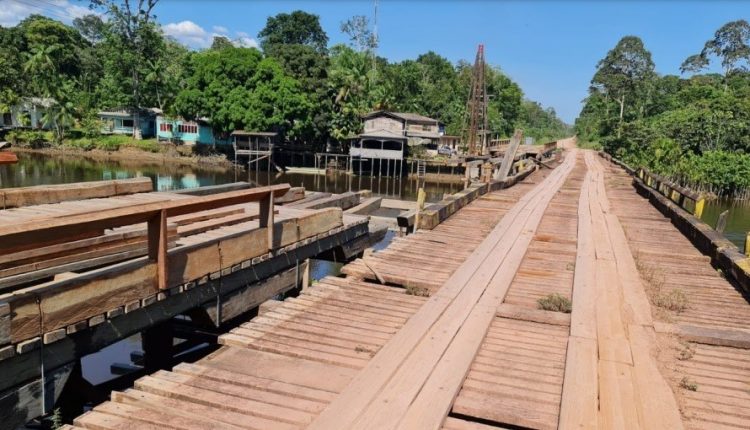A ponte sobre o Rio Vila Nova, construída em madeira, está localizada no trecho do KM 212 da BR-156, que interliga a região do Vale do Jari à capital do Estado.