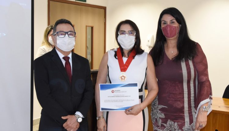A corregedora-geral adjunta do Ministério Público do Amapá, procuradora de Justiça Estela Sá, foi homenageada nesta quinta-feira (2), pelo Conselho Nacional dos Corredores-Gerais do Ministério Público dos Estados e da União, com a medalha de honra pelos relevantes serviços à consolidação das funções institucionais do MP. A entrega da honraria foi feita pelo corregedor-geral do MP-AP, Jair Quintas, e pela presidente do CNPGMPEU, Luciana Sapha Silveira, na abertura da 124ª Reunião do Colegiado, que acontece nos dias 2 e 3, na sede do Ministério Público Militar (MPM), em Brasília-DF.