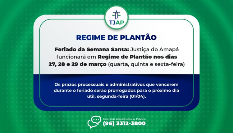 O Tribunal de Justiça do Amapá (TJAP) funcionará em Regime de Plantão de quarta-feira a sexta-feira, dias 27, 28 e 29 de março de 2024, período que corresponde à Semana Santa, Feriado Nacional, previsto no Regimento Interno do TJAP (o Artigo nº 88, parágrafo único, inciso II da Resolução nº 006/2003 – TJAP) e na Resolução 71/2009 do Conselho Nacional de Justiça (CNJ).