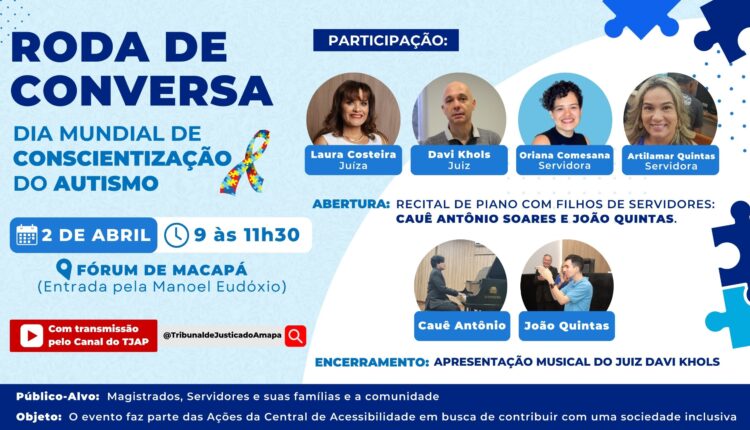 Como parte da programação do Dia Mundial de Conscientização do Autismo e do Abril Azul – Mês de Conscientização sobre o Autismo, o Tribunal de Justiça do Amapá (TJAP), por meio da Central de Acessibilidade da instituição, realiza, na próxima terça-feira (02/04), às 9 horas, no Fórum de Macapá, uma Roda de Conversa com a juíza Laura Costeira e o juiz Davi Schwab Khols, além das servidoras Oriana Comesana e Artilamar Quintas.