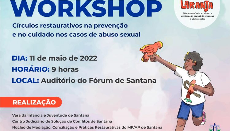 Como parte da programação do Maio Laranja, Mês de Combate ao Abuso e Exploração Sexual de Crianças e Adolescentes, o plenário do Fórum de Santana será palco, nesta quarta-feira (11), das 9h às 11h, do Workshop: os Círculos de Restauração na Prevenção e no Cuidado nos Casos de Abuso Sexual. A realização é da Vara da Infância e Juventude de Santana, do Centro Judiciário de Solução de Conflitos de Santana, do Núcleo de Mediação, Conciliação e Práticas Restaurativas do MP/AP de Santana e da Secretaria de Educação do Estado (projeto E-PAZ).